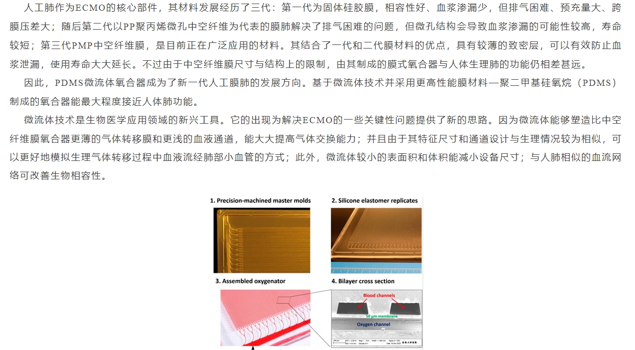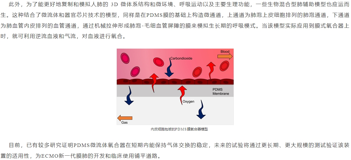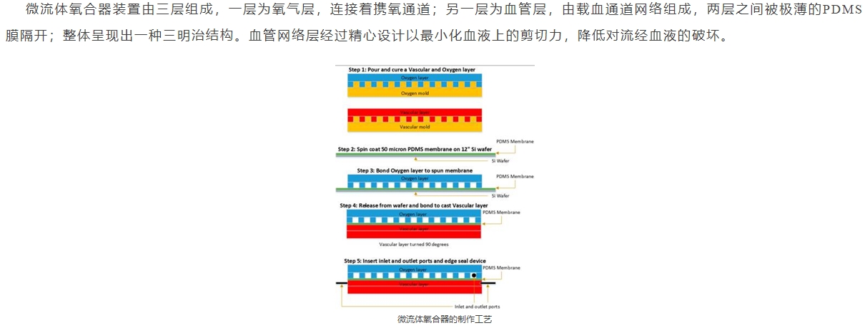 微流体氧合器装置由三层组成,一层为氧气层,连接着携氧通道;另一层为血管层,由载血通道网络组成,两层之间被极薄的PDMS膜隔开;整体呈现出一种三明治结构。血管网络层经过精心设计以最小化血液上的剪切力,降低对流经血液的破坏。