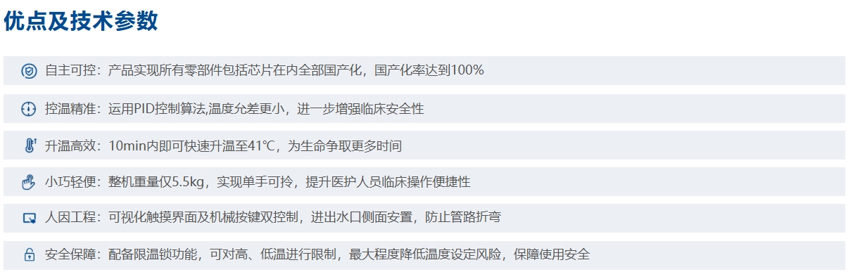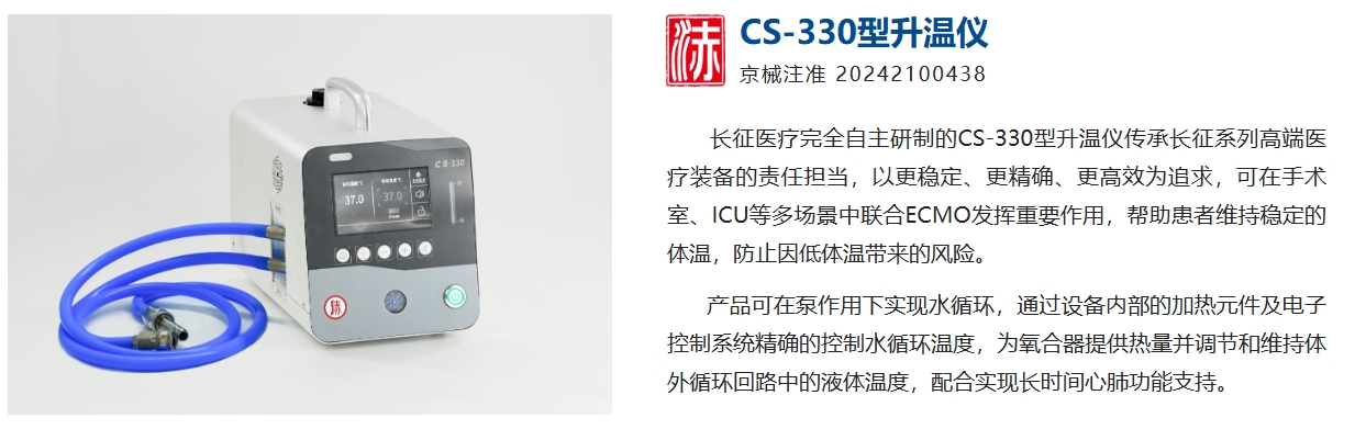 长征医疗完全自主研制的CS-330型升温仪传承长征系列高端医疗装备的责任担当,以更稳定、更精确、更高效为追求,可在手术室、ICU等多场景中联合ECMO发挥重要作用,帮助患者维持稳定的体温,防止因低体温带来的风险。